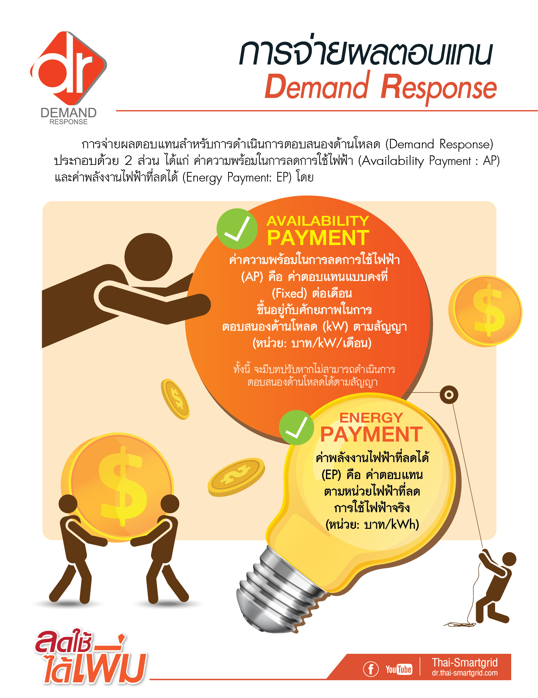 การจ่ายผลตอบแทนสำหรับการดำเนินการตอบสนองด้านโหลด (Demand Response) ประกอบด้วย 2 ส่วน ได้แก่ ค่าความพร้อมในการลดการใช้ไฟฟ้า (Availability Payment: AP) และ ค่าพลังงานไฟฟ้าลดได้ (Energy Payment: EP) โดย