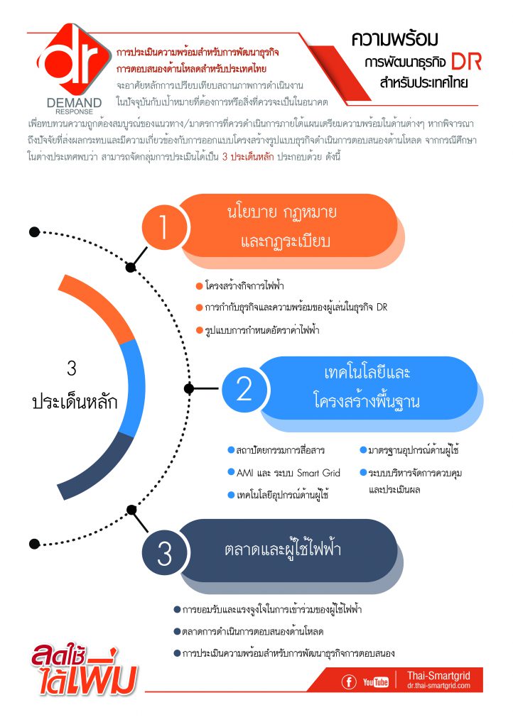 การประเมินความพร้อมสำหรับการพัฒนาธุรกิจการตอบสนองด้านโหลดสำหรับประเทศไทยจะอาศัยหลักการเปรียบเทียบสถานภาพการดำเนินงานในปัจจุบันกับเป้าหมายที่ต้องการหรือสิ่งที่ควรจะเป็นในอนาคต เพื่อทบทวนความถูกต้องสมบูรณ์ของแนวทาง/มาตรการที่ควรดำเนินการภายใต้แผนเตรียมความพร้อมในด้านต่างๆ หากพิจารณาถึงปัจจัยที่ส่งผลกระทบและมีความเกี่ยวข้องกับการออกแบบโครงสร้างรูปแบบธุรกิจดำเนินการตอบสนองด้านโหลดจากกรณีศึกษาในต่างประเทศพบว่า สามารถจัดกลุ่มการประเมินได้เป็น 3 ประเด็นหลัก ประกอบด้วย
