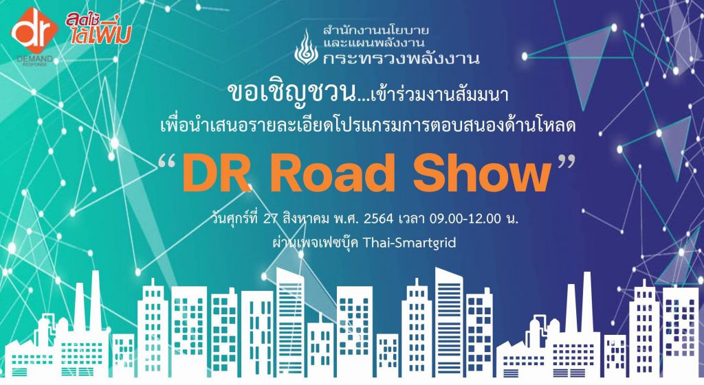 สำนักงานนโยบายและแผนพลังงาน (สนพ.) ขอเชิญชวนเข้าร่วมงานสัมมนาเพื่อนำเสนอรายละเอียดโปรแกรมการตอบสนองด้านโหลด “DR Road Show” ในวันศุกร์ที่ 27 สิงหาคม พ.ศ. 2564 เวลา 09.00-12.00 น. ผ่านเพจเฟซบุ๊ค Thai-Smartgrid โดยมีวัตถุประสงค์เพื่อนำเสนอข้อมูลที่เกี่ยวข้องกับโครงการตอบสนองด้านโหลด (DR) รวมถึงเพื่อสร้างความรู้ความเข้าใจ และร่วมพัฒนาเครือข่ายกลุ่มผู้ใช้ไฟฟ้าหรือผู้ประกอบการที่มีศักยภาพหรือมีโอกาสเข้าร่วมโครงการ และเพื่อรวบรวมข้อมูลศักยภาพ DR ในประเทศไทย